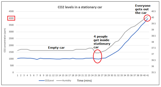 在數(shù)據(jù)記錄器上路之前,我們首先將它用于測試靜止車輛中的二氧化碳水平。 這將顯示在密閉空間中一個4人組對車內二氧化碳濃度的影響。 啟動測試,我們關閉了發(fā)動機和車窗以避免車內新鮮空氣流動。 數(shù)據(jù)記錄顯示,當乘客進入車內時,二氧化碳濃度為1000 ppm。 然后在15分鐘內飆升至近4000 ppm。 在那段時間,車內的氣氛變得非常悶熱和令人不快。