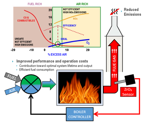 完全燃燒需要正確的燃料和氧氣比。這個比率,可以通過在一個閉環(huán)反饋系統(tǒng)中使用氧傳感器測量排氣/煙道氣中的氧濃度來調(diào)節(jié)輸入結(jié)構(gòu)的控制器來優(yōu)化和維持。當供應的燃料的品種是各種各樣的時候這個就顯得特別有用(即來自不同源頭的氣體)。