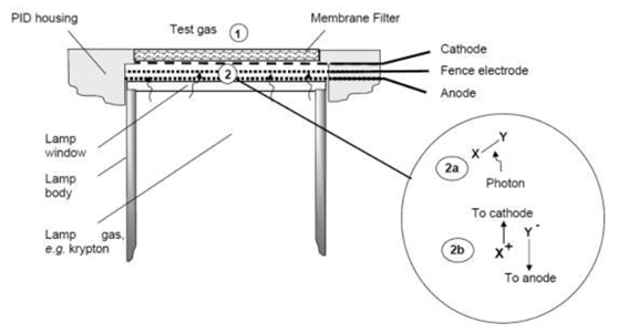 PID-A1 和 PID-AH 利用光電離檢測(cè)原理測(cè)量空氣中可揮發(fā)性有機(jī)化學(xué)物(VOC) ,如下圖所示。 試氣(1) 通到光離子元件頂部的薄膜過(guò)濾器并自由擴(kuò)散進(jìn)出由過(guò)濾器,室壁和一個(gè)UV燈窗形成的下層室。燈泡發(fā)出高能量的UV光線(以箭頭表示),穿過(guò)窗口。當(dāng)光子被分子吸收,室內(nèi)產(chǎn)生光電離,產(chǎn)生兩個(gè)電荷離子,一個(gè)正電荷X+,一個(gè)負(fù)電荷Y-(2a)。 正負(fù)電極之間產(chǎn)生電場(chǎng),吸引離子(2b), 所產(chǎn)生的與VOC濃度成正比的電流,可被測(cè)量并用于判定氣體濃度。 PID-A包含第三個(gè)柵電極(專(zhuān)利),用于確保放大電流中不包含其他電流源如室壁的水冷凝產(chǎn)生的明顯分量。