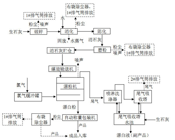 漂白粉的生產(chǎn)系統(tǒng)由生石灰消化、漂白粉生產(chǎn)和尾氣處理工序三部分組成。