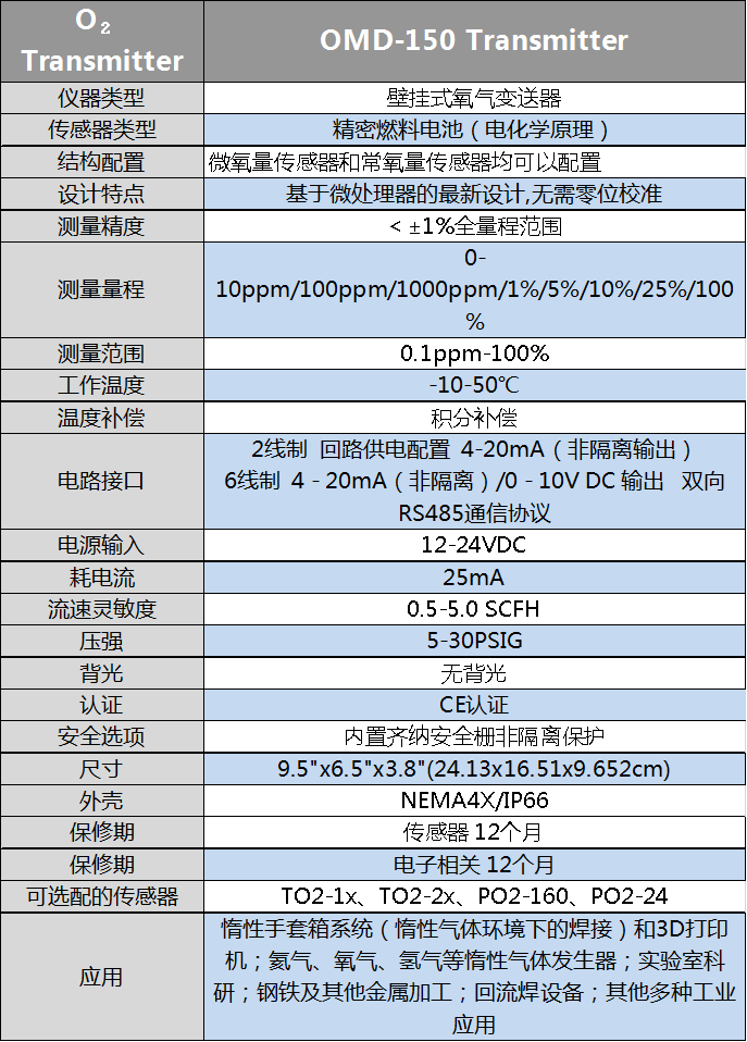 OMD-150是一個新型的、獲得CE認(rèn)證的、基于微處理的氧氣變送器。該變送器能夠根據(jù)具體的應(yīng)用需求配置成微量氧或者常量氧檢測。這對煉鋼是非常重要的,因為煉鋼需要全氧或者微量氧同時監(jiān)測,它是可完全配置的,從而還能滿足其他絕大部分微量氧和常亮氧分析的工業(yè)應(yīng)用需求。該分析儀配有專用的世偉洛克管配件,一種是1/8英寸的,另一種是1/4英寸的,還有6mm的,緊湊的結(jié)構(gòu)使傳感器的壽命更長。各種可選的電氣接口方式、不同量程的傳感器以及氣路連接方式,使得該變送器成為一個經(jīng)濟(jì)且維護(hù)成本低的解決方案。具體參數(shù)特點如下:
