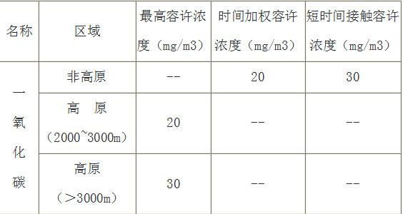 規(guī)定:車(chē)間內(nèi)允許高CO濃度為30mg/m3,當(dāng)作業(yè)時(shí)間一次不超過(guò)30min時(shí),CO允許濃度可放寬到100 mg/m3,當(dāng)作業(yè)時(shí)間為10~20min內(nèi)大允許濃度為200mg/m3。